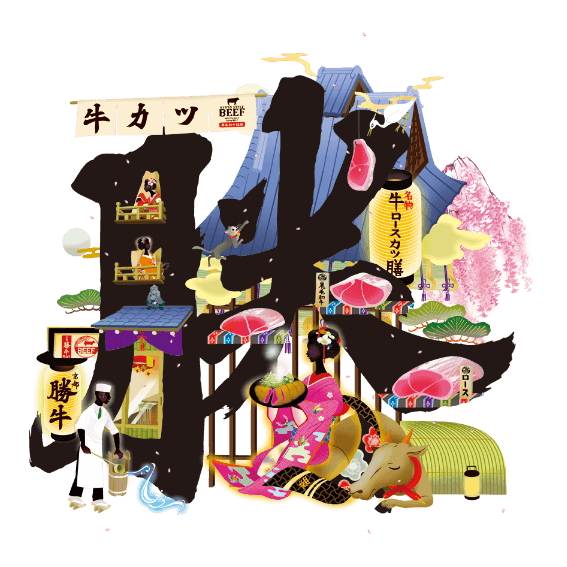 I received a suggestion that “I want to spread the wonderful culture of Kyoto to the world through the GYUKATSU Kyoto Katsugyu brand,” and I wrote this new article. By writing the word “Katsugyu” and the picture of a cow in traditional ink, and mixing it with a richly colored picture, the result is a picture that represents modern-day Kyoto, which is in the midst of tradition and innovation. I’m finishing it. Please pay attention to the stories scattered throughout, such as the culture and cityscape that you can only understand by living in Kyoto.
